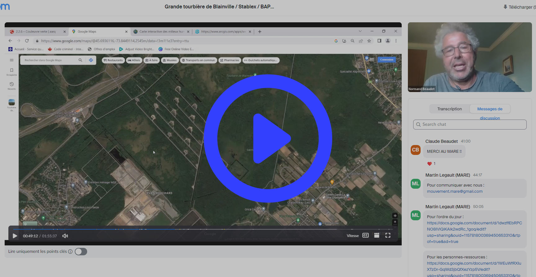 Le 24 mai 2023, la Coalition Oui à la Grande Tourbière de Blainville, NON à Stablex, organisait une courte séance d’information pour ceux et celles qui souhaitent formuler un commentaire ou un mémoire au BAPE pour le projet de Stablex. Vous pouvez visionner la rencontre en cliquant sur l'image ci-dessous...