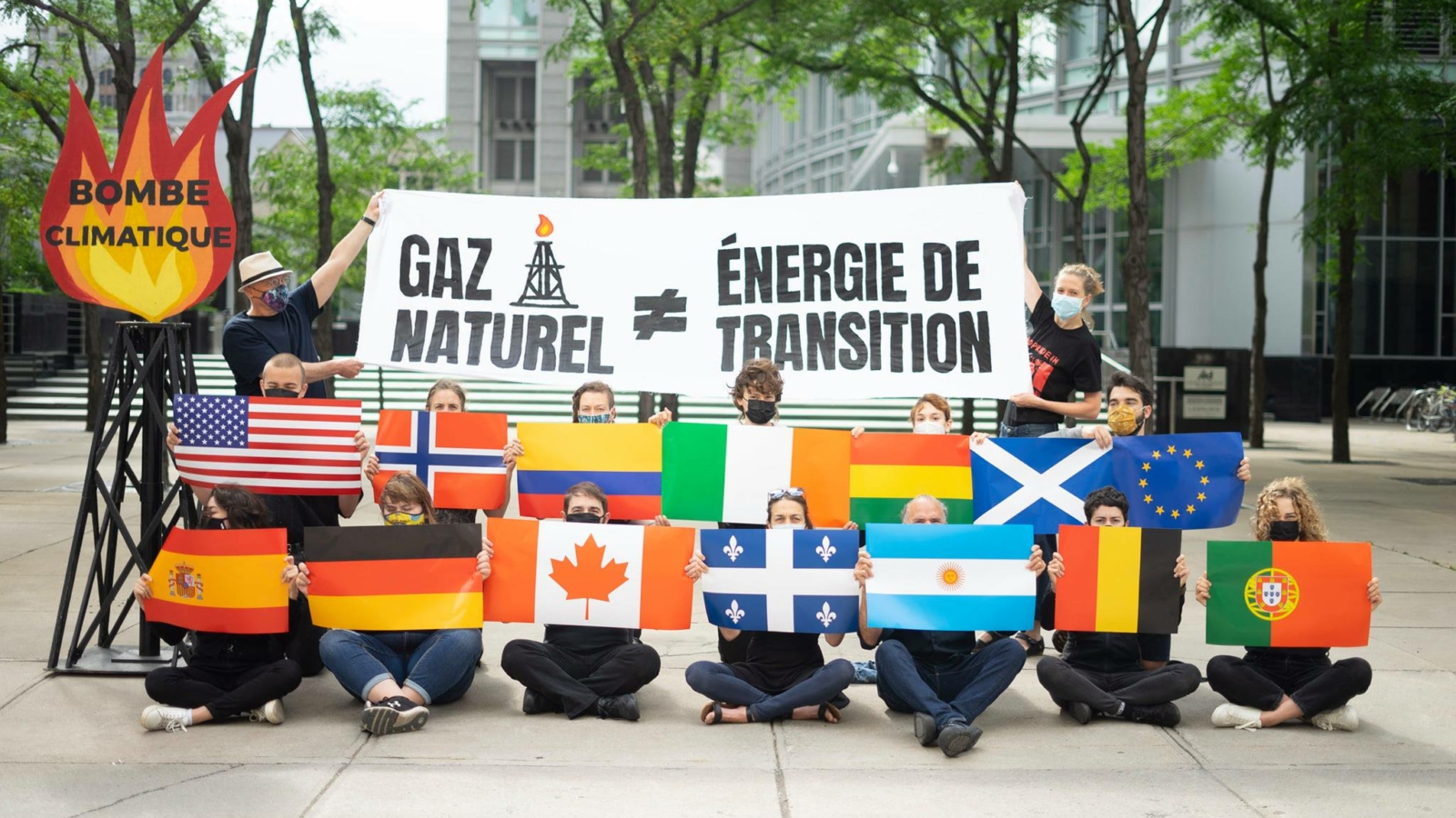 Une vingtaine de militant-e-s ont déployé une mise en scène incluant notamment une bannière où on pouvait y lire « Gaz naturel =pas Énergie de transition ». Les drapeaux de la dizaine de pays où des actions se déroulaient durant la journée étaient également visibles ainsi qu’un modèle réduit d’une tour de fracturation hydraulique et d’un gazoduc accompagné d’une flamme où l’on pouvait lire « BOMBE CLIMATIQUE ».