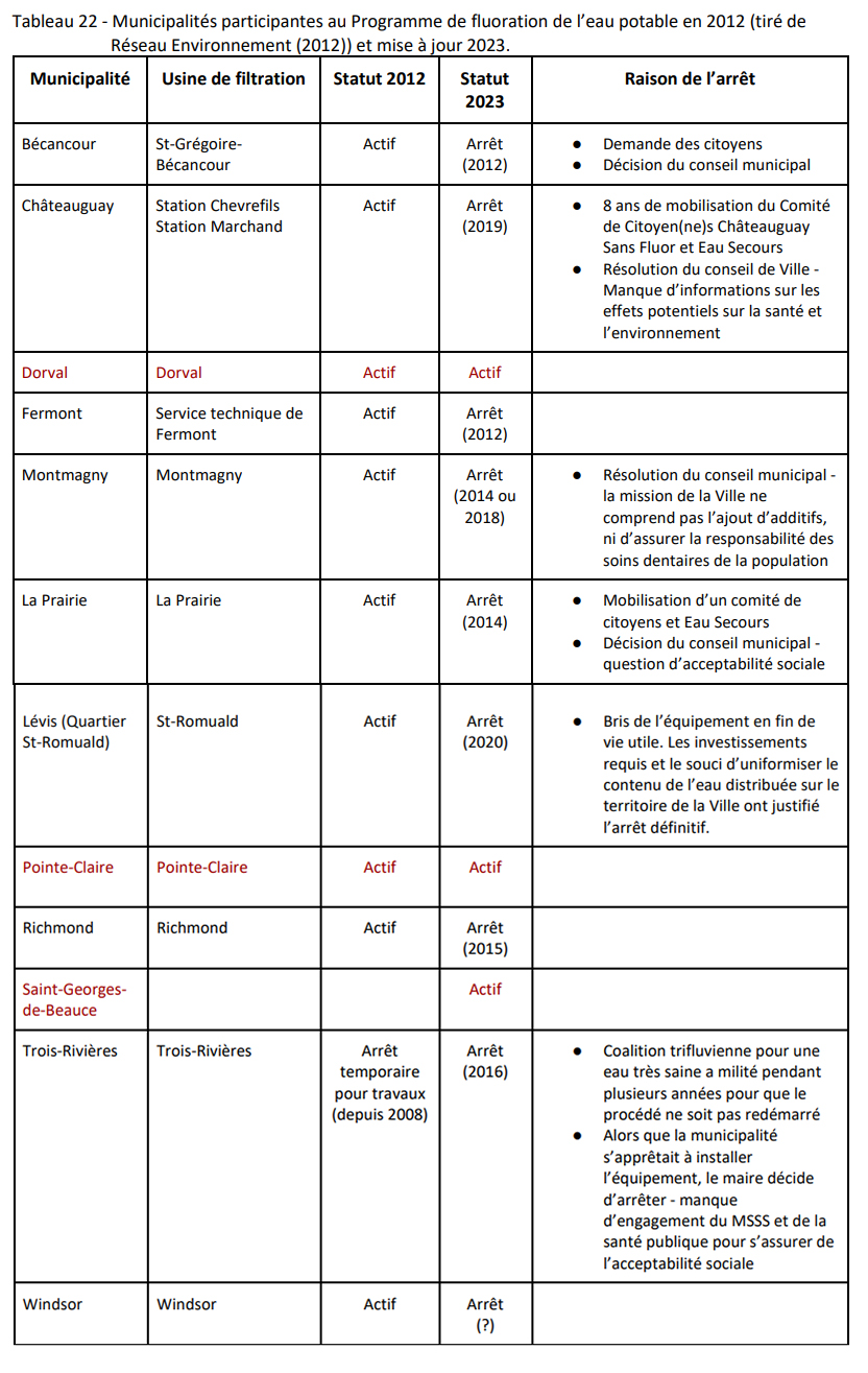Tableau faisant état de la situation de la pratique de fluoration de l’eau potable au Québec, extrait du rapport du Service de l’eau de Montréal. On constate l’importante mobilisation citoyenne dans la colonne «Raison de l’arrêt»!