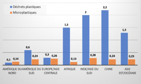 On estime que la quantité de microplastiques secondaires varie d’un continent à un autre et est principalement le résultat de mauvaises pratiques de recyclage ou de gestion des déchets plastiques27. Le graphique adjacent nous montre cette différence. En effet, les régions du monde ayant peu de moyens pour gérer leurs déchets plastiques (p.ex. Afrique, Inde, Asie du Sud) présentent une quantité de déchets plastiques de toutes dimensions (colonnes bleues) très élevée comparée à leur quantité de microplastiques secondaires (colonnes orange). L’Amérique du Nord et l’Europe ont le problème inverse : autant de microplastiques secondaires qui polluent leurs milieux marins que de déchets plastiques divers.