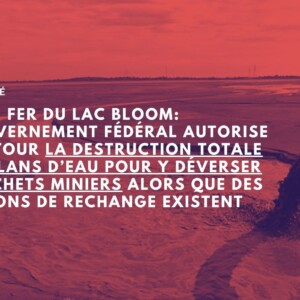 Le fédéral a donné son aval au projet d’expansion des parcs à résidus miniers et des haldes à stériles de la mine du Lac Bloom en ajoutant les lacs et rivières entourant le projet à sa liste d’exceptions à l’interdiction de détruire des habitats du poisson. Ce sont donc 37 plans d’eau entourant le site minier, représentant 156 hectares d’habitat du poisson et bien davantage de milieux naturels en tous genres, qui seront détruits à perpétuité. Le fédéral emboîte ainsi le pas au provincial, à l’encontre de l’avis du BAPE, des scientifiques et de l’opinion publique, et crée un dangereux précédent.