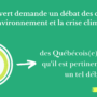 « Le message de la part des Québécois(e)s en matière d’environnement, d’adaptation, d’atténuation et de protection de l’environnement est clair: l’inquiétude quant aux conséquences des changements climatiques est palpable et les attentes envers le gouvernement pour qu’il fasse mieux sont élevées. Dans ce contexte, un débat des chef(fe)s exclusif sur l’environnement et le climat est nécessaire et essentiel », affirment les groupes de l’initiative Vire au vert.