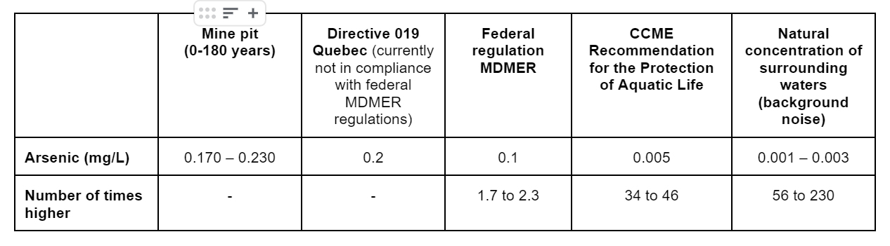 In its Surface Water Quality Modeling report (ref 2), the proponent assesses the arsenic concentrations in the pit after operations. Based on this modeling, arsenic concentrations would range from 0.20 to 0.23 mg/L until approximately 60 years after cessation of operations. Thereafter, they would not decrease below 0.170 mg/L even after 180 years (ref 2, Figure 10). However, these levels are approximately 2 times higher than the Metal and Diamond Mining Effluent Regulations (MDMER), approximately 40 times higher than the Canadian Council of Ministers of the Environment (CCME)’s guideline for the protection of aquatic life in freshwater (0.005 mg/L), and up to 230 times higher than naturally occurring levels of arsenic in the surrounding waterways (see Table 1 below).
