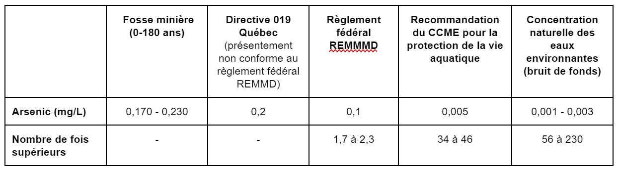 Dans son rapport de modélisation de la qualité des eaux de surface (réf 2), le promoteur évalue les concentrations d’arsenic dans la fosse après les opérations. Selon cette modélisation, les concentrations d’arsenic se situeraient entre 0,20 et 0,23 mg/L jusqu’à environ 60 ans après l’arrêt des opérations. Par la suite, elles ne diminueraient pas en-dessous de 0,170 mg/L et ce, même après 180 années (réf 2, Figure 10). Or, ces niveaux sont environ 2 fois supérieurs à la norme prescrite (0,1 mg/L) par le Règlement des effluents des mines de métaux et des mines de diamants (REMMMD), environ 40 fois supérieurs aux recommandations du Conseil canadien des ministres de l’environnement (CCME) pour la protection de la vie aquatique en eau douce (0,005 mg/L), et jusqu’à 230 fois supérieurs aux niveaux d’arsenic naturellement présents dans les cours d’eau environnants (voir Tableau 1 ci-dessous).
