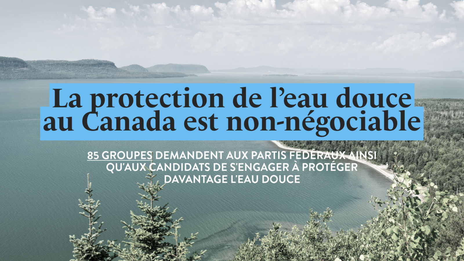 Nous, soussignés, exigeons que tous les partis politiques ainsi que tous les candidat·e·s s’engagent à protéger et défendre l’intégrité des bassins versants au Canada, leurs écosystèmes ainsi que tous les accords qui les protègent.