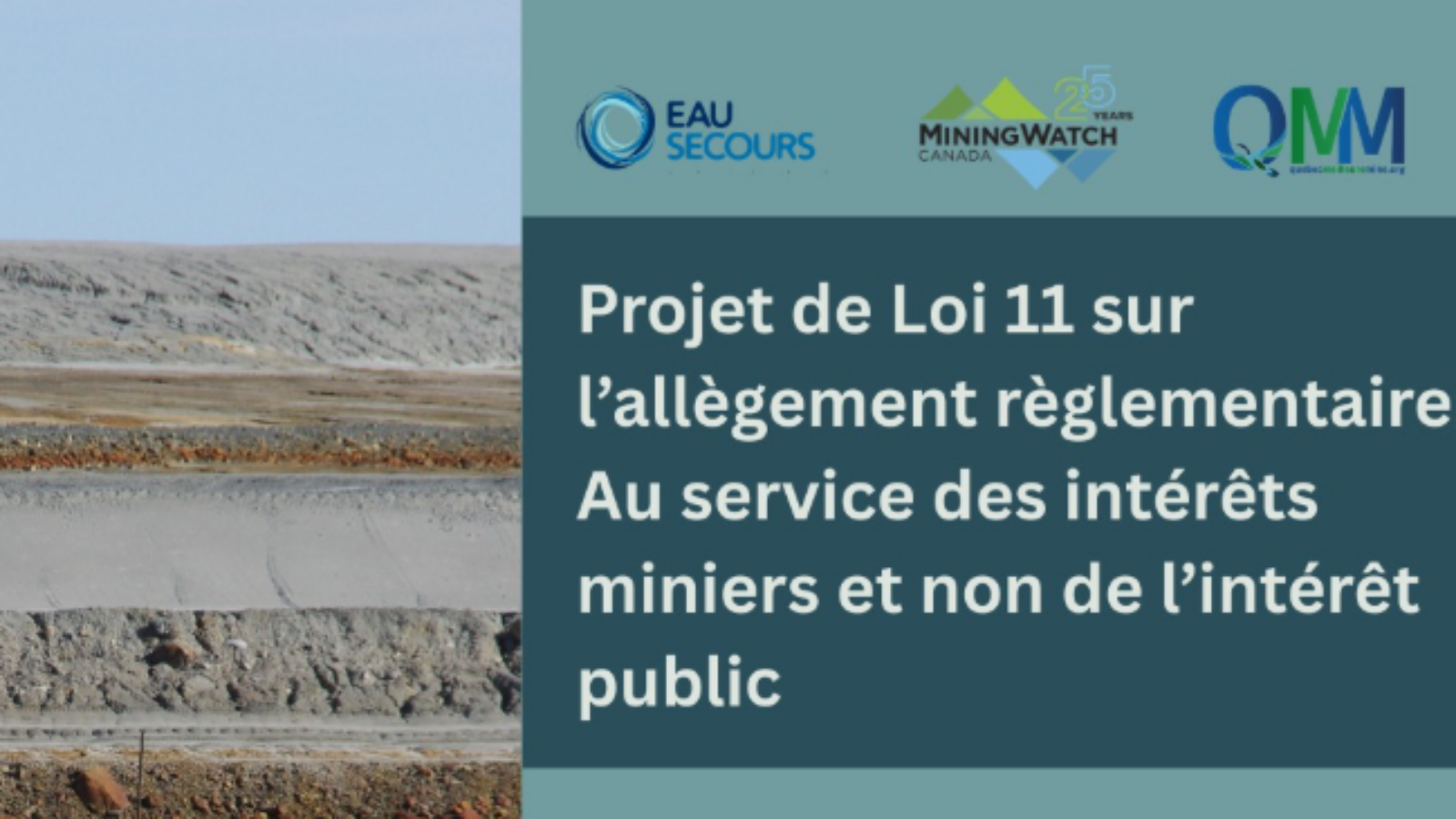 Québec – Alors que le gouvernement Québécois introduit plusieurs projets de lois qui visent effriter la démocratie et augmenter la poigne autoritaire sur les ressources naturelles, la Coalition Québec meilleure mine, MiningWatch Canada et Eau Secours seront présents en commission parlementaire mercredi le 4 février à 17h30 pour présenter leur mémoire sur le Projet de Loi 11 modifiant diverses dispositions principalement aux fins d’allègement du fardeau réglementaire et administratif.
