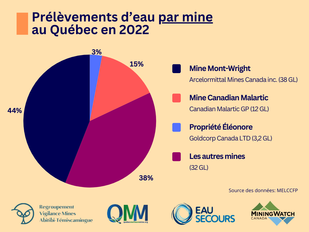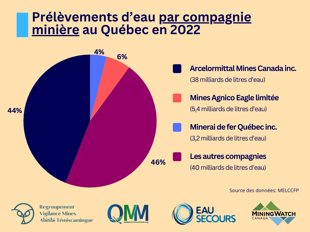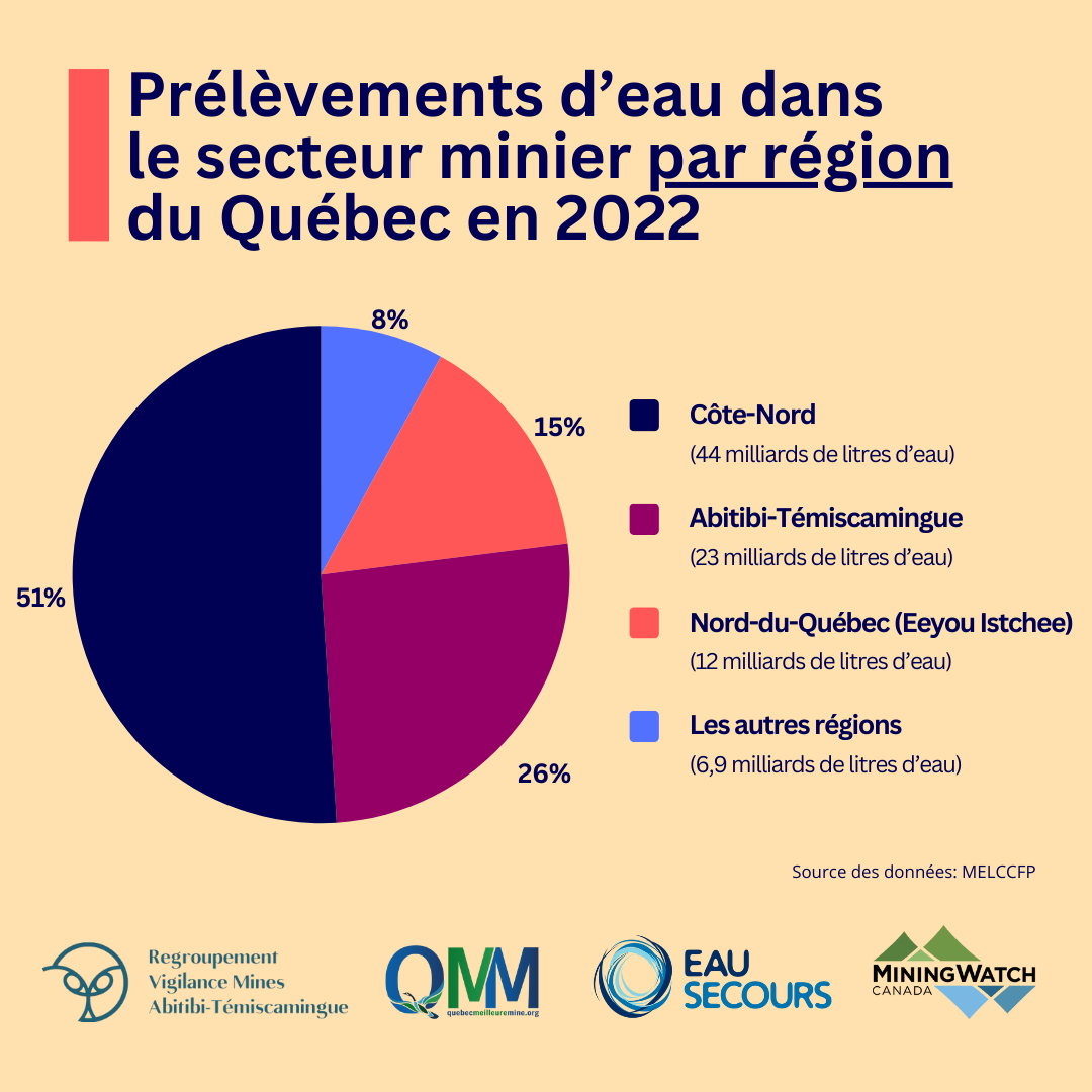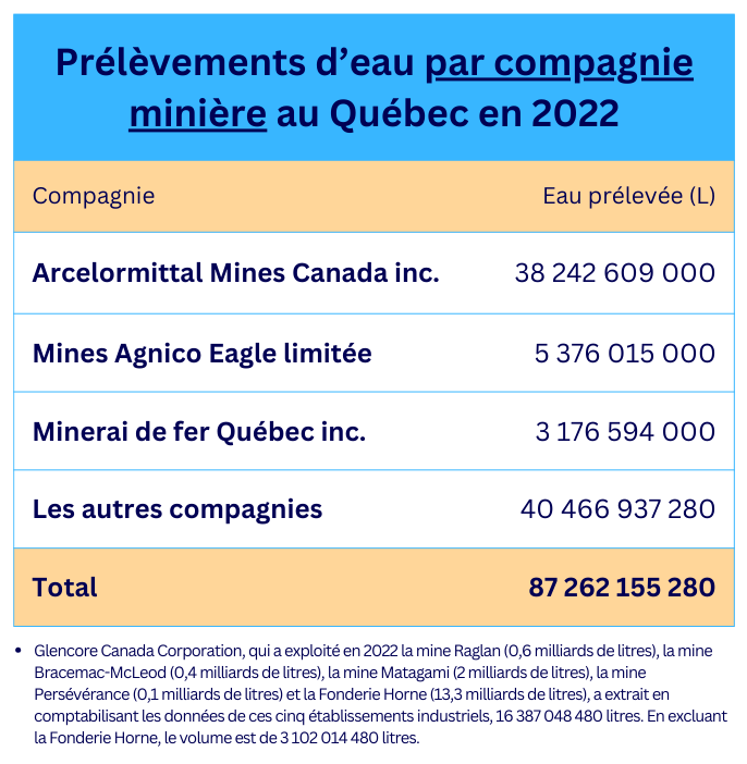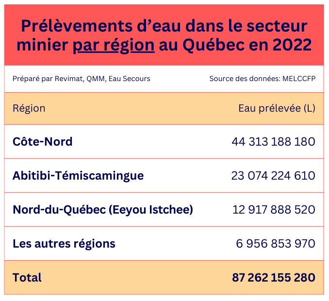 En 2022, les données du MELCCFP indiquent que 29 établissements industriels (mines) associés à 19 compagnies minières ont prélevé de l’eau douce à même le patrimoine commun du Québec dans cinq (5) régions différentes.