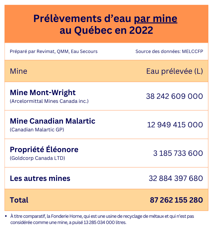 En 2022, les prélèvements en eau par les compagnies minières étaient assujettis à une redevance d’à peine 2,50 $ par million de litres (2,50$/ML). C’est donc dire que l’État québécois a perçu uniquement 218 155,39 $ pour les 87,3 milliards de litres puisés à même le bien commun.